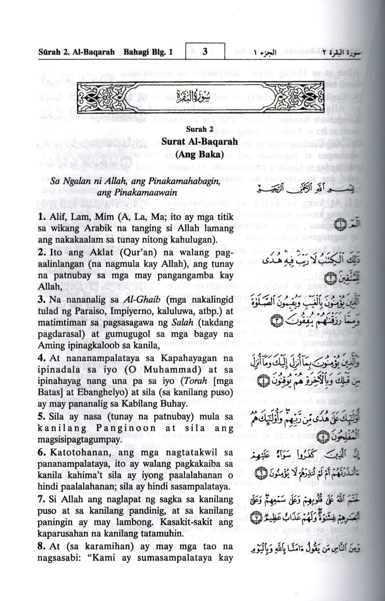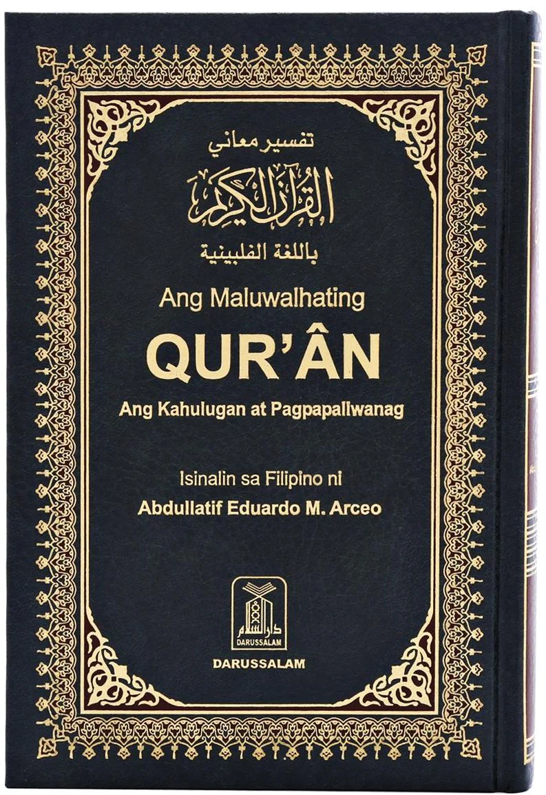 Filipino language translation of The Noble Quran with side by side Arabic script and tafsir (explanation) on the bottom.Filipino is the national language of the Philippines