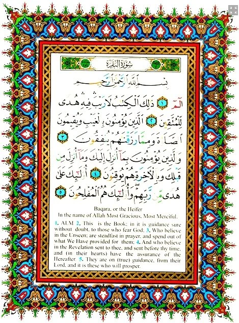 Meanings of the Quranic versus are translated into English and placed on the margins around the Arabic text.