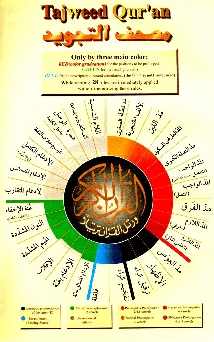 The reader will get used to reciting the quran by using color just as he got used to stopping at red lights and passing though green lights. By engaging in this sublime act, the reader will find him self applying 24 rules of tajweed with ease and precision while his mind is left free to contemplate and understand the meaning of holy quran.
